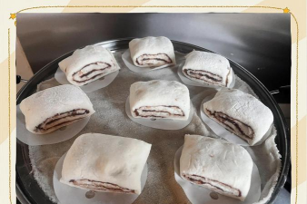 - 蒸锅加水烧开,将卷好的糯米卷放入蒸20-25分钟,直到表面凝固且松软。