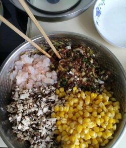 # 2. 制作饺子馅基础馅料:虾仁与香菇混合,加入葱姜末、生抽、蚝油、花椒粉、盐(宝宝期建议用儿童酱油替代)和适量食用油,搅拌均匀。
