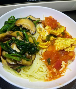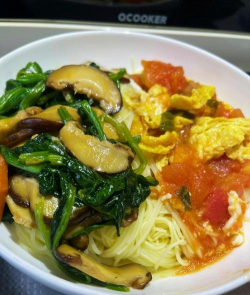 - 将煮熟的面条倒入锅中,与西红柿香菇混合翻炒。