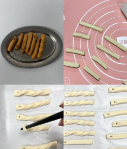 - 擀成条状后左右扭转成麻花或拐杖形状。