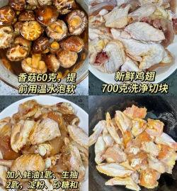 鸡翅划刀后用料酒、生抽腌制15分钟,香菇提前泡发并焯水,可有效去除腥味