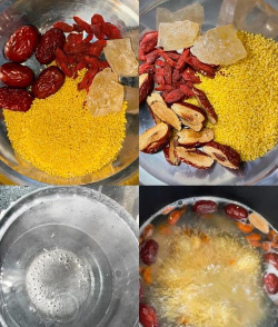 - 将浸泡好的小米和红枣放入砂锅中,加入1000-1500毫升清水(水量可根据粥的浓稠度调整)。