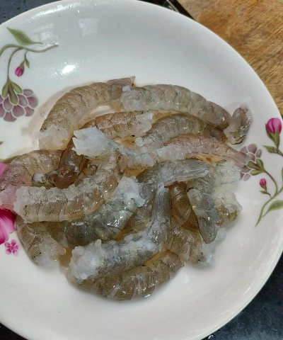 # 步骤 食材预处理- 虾仁洗净后划刀背,用料酒、盐和胡椒粉腌制10分钟;