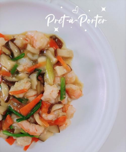 - 倒入虾仁丁,加盐调味,用水淀粉勾芡;
