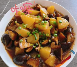 - 土豆片先下锅至透明,再加入胡萝卜丁翻炒。 - 放入香菇后淋入生抽、蚝油,最后勾芡收汁。