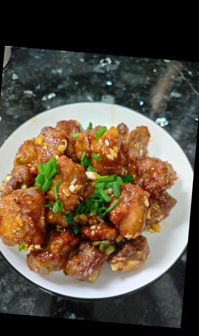 1. 排骨腌制15分钟,裹淀粉后炸至金黄酥脆,捞出备用。2. 锅中留底油,爆香蒜末、姜片和干辣椒,加入豆瓣酱炒出红油。3. 倒入生抽、糖、耗油翻炒均匀,加入适量清水煮开。4. 放入炸好的排骨,中火焖煮15分钟,至汤汁浓稠。5. 最后勾芡收汁,撒上葱花点缀。