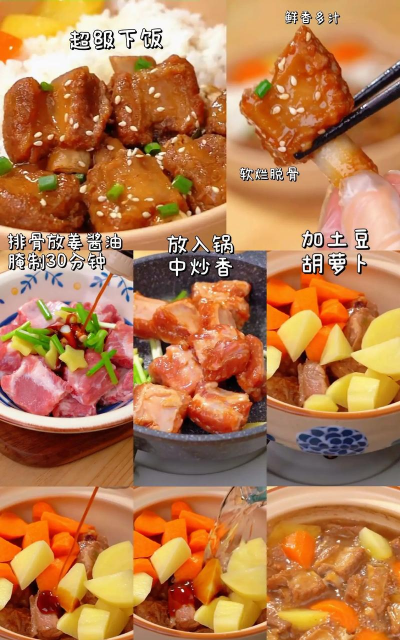 预处理:排骨焯水去腥,土豆胡萝卜切块备用。2. 炖煮:锅中放油炒糖色,加入排骨翻炒后加入土豆胡萝卜,倒入足量水炖煮40分钟。3. 调味收汁:加入生抽、老抽、盐调味,中火炖至汤汁浓稠,肉质软烂即可。