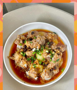 排骨预处理:排骨洗净切块,冷水下锅加料酒焯水去腥,捞出后冷水过凉备用。2. 腌制排骨:将排骨与盐、胡椒粉、生抽、蚝油、生粉、老抽、白糖混合均匀,腌制30分钟。3. 混合食材:腌制好的排骨裹上调料,加入蒜末和炒香后的客家咸菜,翻炒均匀。4. 蒸制:将混合食材铺在蒸盘底部,大火蒸30分钟,至排骨熟透且咸菜入味。5. 收汁装盘:蒸好后撒上葱花,淋上热油提香即可。