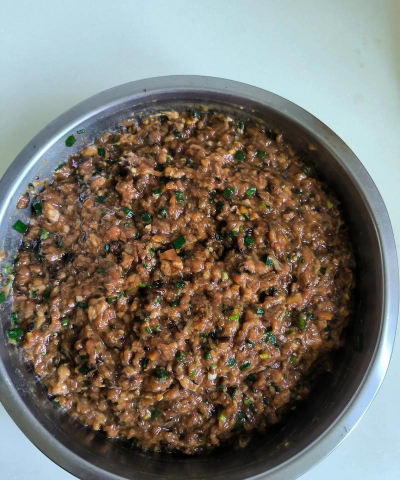- 猪肉末加入葱姜末、生抽、老抽、蚝油、盐、白胡椒粉等调料,搅拌均匀至上劲。