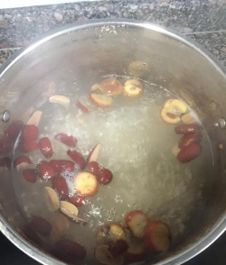 - 加入山楂干、红枣,继续用小火炖煮1.5-2小时,期间可加入适量冰糖调味。