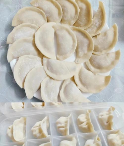 # 3. 包制饺子取饺子皮,放适量馅料,对折捏合成半月形饺子。包好的饺子可摆放备用。