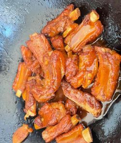 收汁时可用筷子轻翻排骨,使其均匀裹糖色。