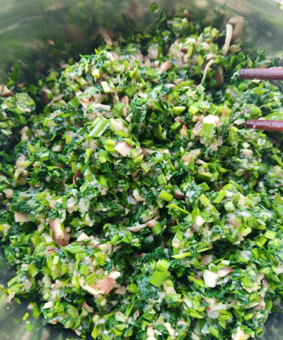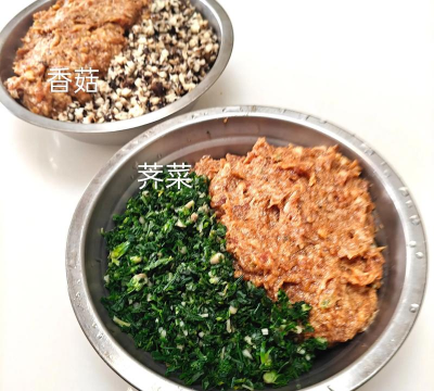 - 荠菜洗净后焯水至翠绿色,捞出过凉后切碎备用。 - 猪肉末加入葱姜末、生抽、老抽、胡椒粉、盐,顺时针搅拌至上劲。 - 加入香菇丁,翻炒至香菇变软后,倒入荠菜碎,调入盐、鸡精、香油,混合均匀。