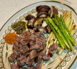 加入牛排:将煎好的牛排条摆放在蔬菜上,可搭配煮熟的鹌鹑蛋或培根增加口感。