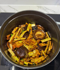 - 放入香菇、红椒,大火烧开后转小火炖煮40-60分钟(时间根据笋的硬度调整)。