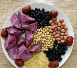 三、营养与功效紫米: 富含维生素B族、矿物质及膳食纤维,具有补血、健脾作用。- 红枣