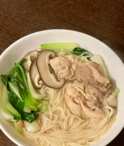 - 另起锅煮面至熟透,捞出后放入碗中,浇上香菇鸡块汤,加入盐、胡椒粉调味。
