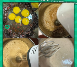 蛋黄糊:鸡蛋黄加入红糖、玉米油、牛奶,搅拌均匀至顺滑无颗粒。- 蛋清打发:蛋清分三次加入糖,打发至提起打蛋头呈直角(干性发泡)。#### 3. 面糊制作