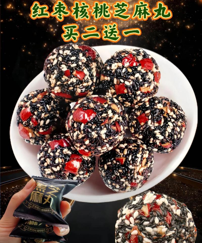 - 将炒好的黑芝麻、核桃仁与切碎的红枣混合,加入蜂蜜,翻炒均匀。3. 成型与保存