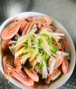 - 蒸锅加水烧开,放入北极虾,大火蒸5-7分钟(时间根据虾的大小调整)。