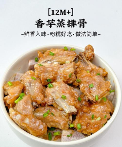 - 装盘:将芋头铺在蒸盘底部,再放上排骨,确保紧密贴合以促进入味