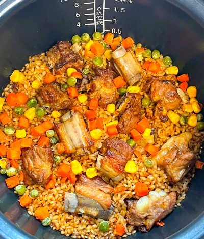 - 将排骨与汤汁倒入电饭煲,加入浸泡好的大米,按比例加水(水量比米高1-2厘米)