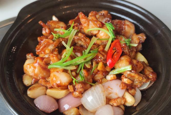 最后加入牛蛙和鹌鹑蛋(可选),煮至蛋液凝固、肉质酥烂。汤汁浓稠时调入盐,中火收汁至汤汁包裹食材即可出锅。