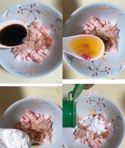 - 加入排骨翻炒至表面微黄,再倒入生抽、老抽、糖翻炒均匀。