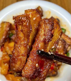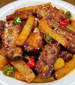 翻炒排骨:加入焯水后的排骨翻炒至微焦,倒入酱汁翻炒均匀。