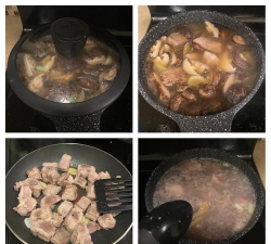 - 加入香菇泡发水(高汤)和清水,水量没过食材2厘米;