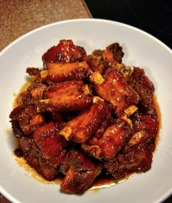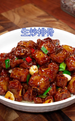 - 倒入炸好的排骨,加生抽、老抽调味,翻炒均匀后加水炖煮至汤汁浓稠,肉质酥烂脱骨。