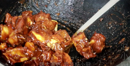 - 加入米酒翻炒至酒精挥发,再倒入酱油、糖调色。