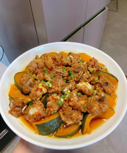 - 开大火收汁至汤汁浓稠,南瓜与排骨完美融合。 - 撒上香茅草装饰,即可装盘。