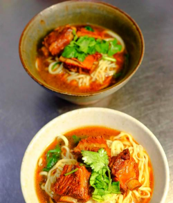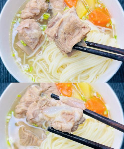 煮面:另起锅烧开水,加入适量盐(约1克/100克面),煮至面条筋道后捞出过凉水,沥干备用。- 组合装盘:将炖好的排骨铺在面条上,浇上红烧汤汁,撒上葱花、香菜点缀。