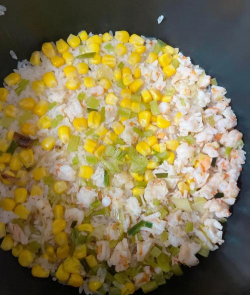 - 饭煮至熟透后,开盖搅拌均匀,让香气充分融合。