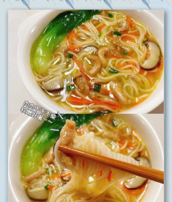 # 5. 组合装盘- 另起锅煮熟面条,捞出后放入香菇鸡块汤中略煮2分钟,避免面条过软。