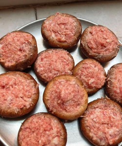 - 将香菇蒂部切碎,与肉馅混合,填入香菇孔中,压实使肉馅分布均匀。