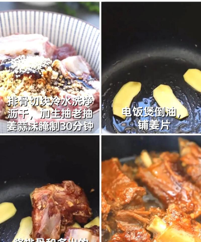 焯水去腥:排骨冷水下锅,加姜片、料酒,煮开后撇去浮沫,焯水5-8分钟,捞出过冷水备用。2. 炒糖色:锅中放少量油,加入冰糖小火炒至溶化呈红色糖浆。3. 煸炒排骨:加入焯水后的排骨翻炒,裹上糖色后加入生抽、老抽、料酒继续翻炒。4. 慢炖入味:加清水没过排骨,小火炖煮40-50分钟,至肉质酥烂。最后大火收汁,汤汁浓稠即可。