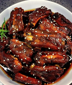 汤汁呈琥珀色或红褐色,包裹着酥软的排骨,骨肉分离,入口即化。