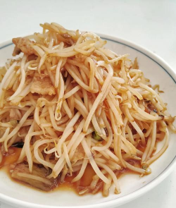 - 放入豆芽大火翻炒至断生,加入生抽、盐、糖调味。