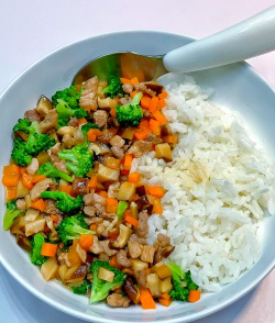 - 将炒好的青菜和香菇连汤汁淋在米饭上,可搭配葱花或香菜装饰。