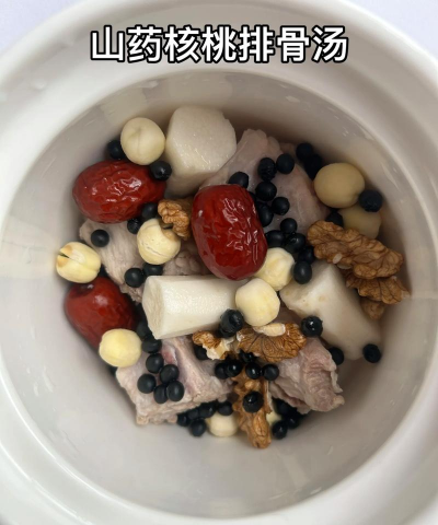 - 先将猪骨、核桃仁、莲子肉放入锅中,加清水大火煮开,撇去浮沫后转小火炖30分钟