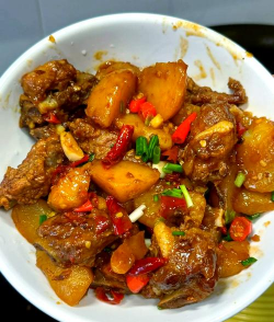焗烤版: 在电饭煲底部铺上锡纸,放上排骨和土豆,加入腌料和水,按下煮饭键即可。- 辣味版