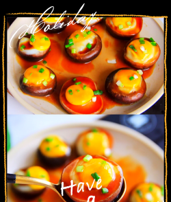 - 香菇去蒂划十字,挤干水分;鹌鹑蛋打入碗中加盐搅拌备用。