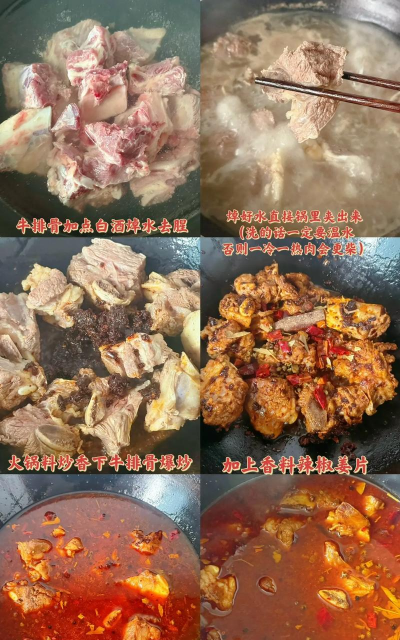 选材: 选择带骨且肉质丰富的牛排骨更佳。- 焯水