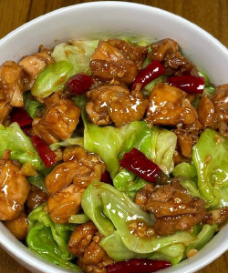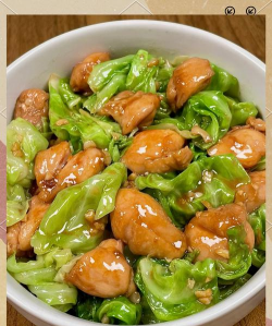 - 鸡腿去骨切块,包菜切块或撕成小块备用。2. 炒制过程: