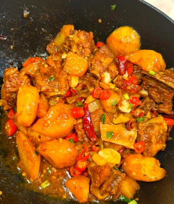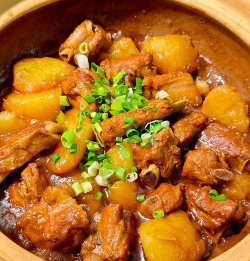 - 开大火收汁,汤汁浓稠红亮,裹满排骨和土豆。