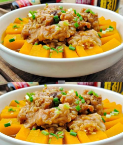 - 在蒸排骨的蒸碗中加入南瓜块,再注入适量清水,隔水焖煮30-40分钟,直到南瓜软烂且汤汁浓稠