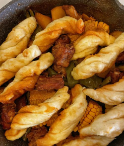 砂锅中加入焯水后的排骨,铺上蔬菜。将卷子摆放在蔬菜上,确保汤汁覆盖食材。