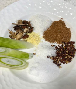 - 蒜蓉酱料与蚝油、生抽等混合,加入姜片、葱段,抓匀后放入排骨中。